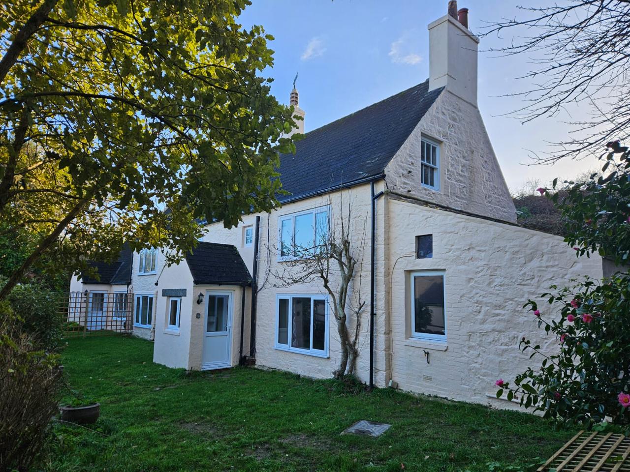 Surrounded by greenery, the property exudes charm from the moment you arrive. Inside the main cottage, you will find a spacious lounge ideal for relaxing or entertaining, alongside a dedicated dining room perfect for family meals and gatherings. The kitchen has been thoughtfully updated with modern fittings while preserving its rustic appeal, creating a warm and functional space for cooking and hosting. A separate study/office provides a quiet and versatile area for remote work or creative pursuits. Upstairs, three well-proportioned bedrooms – one with an en-suite – and a family bathroom benefit from generous natural light and serene views of the surrounding landscape.